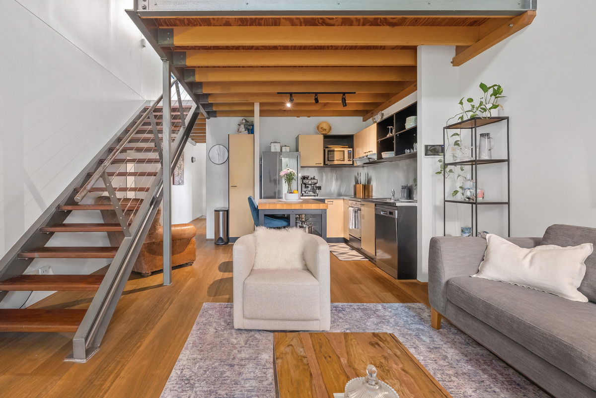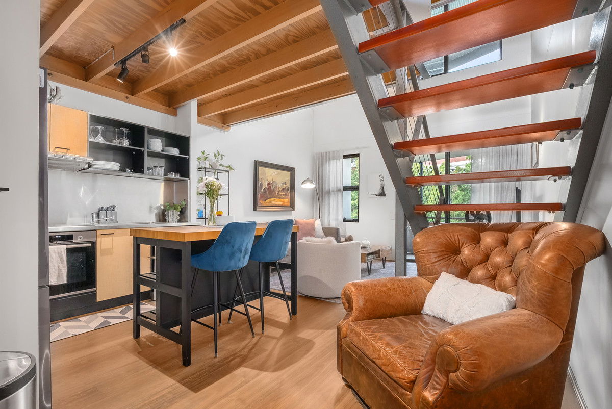 The thoughtful renovations include new flooring, a fully renovated upstairs bathroom, electric blinds on the high windows, and a newly enclosed upstairs bedroom for added privacy.